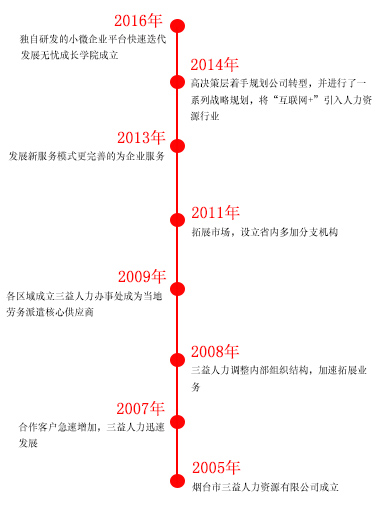 2008年8月,鄄城縣三益人力資源開(kāi)發(fā)有限公司正式成立,鄄城公司的成立為公司今后的發(fā)展發(fā)揮重要作用。煙臺(tái)三益人力資源有限公司總部于2009年07月06日在煙臺(tái)工商局注冊(cè)成立。在公司發(fā)展壯大的10年里,我們始終為客戶(hù)提供好的產(chǎn)品和技術(shù)支持、健全的售后服務(wù)。公司先后在三十里堡、科信大廈、業(yè)達(dá)智慧谷、天宇市場(chǎng)開(kāi)設(shè)了店鋪。2017年3月,三益威海分公司成立,大大拓寬了我們的國(guó)內(nèi)市場(chǎng)。